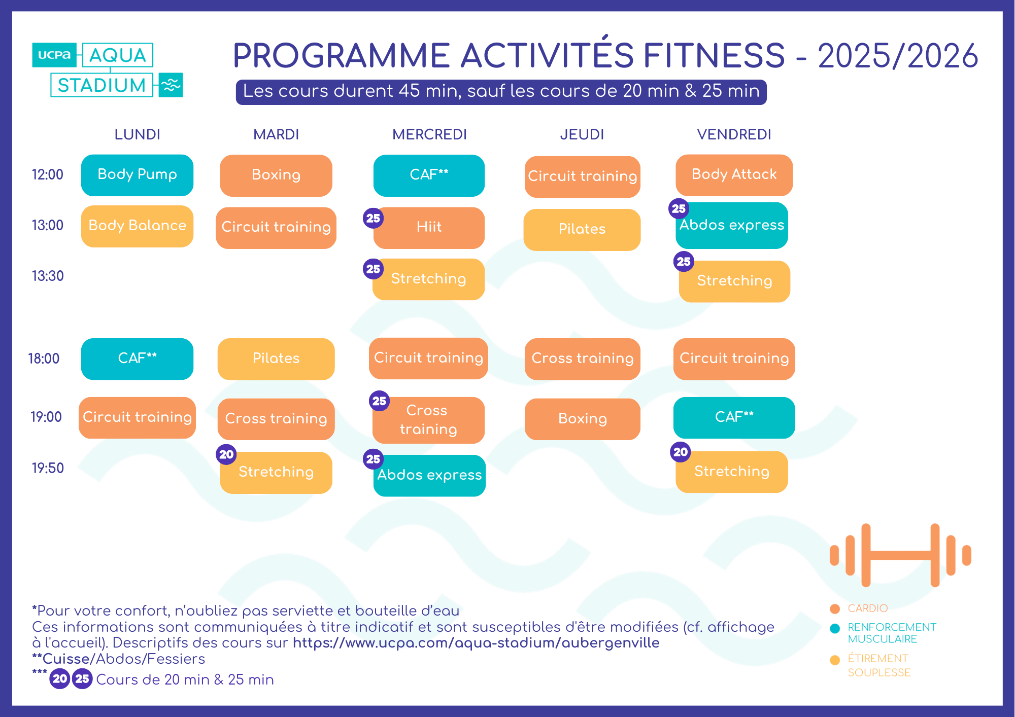 Prévoir une bouteille d'eau. Une tenue de sport avec des chaussures propres adaptées sont exigées ainsi qu’une serviette ( obligatoire sur les appareils de musculation).