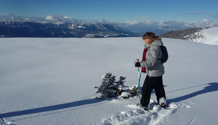 Préparez-vous pour l'une des plus belles journées de raquettes dans les Alpes ! Nous commencerons par un transfert vers Mont Armand, où nous plongerons dans les sous-bois avant d'atteindre le plateau du Barioz. À travers la forêt et les clairières de cette station de ski de fond, nous mettrons le cap sur le sommet du Grand Rocher. La montée est agrémentée d'une vue imprenable sur les massifs environnants ; comptez combien vous pouvez en reconnaître parmi les dix géants alpins qui se dressent devant vous. Au sommet, ne manquez pas la chance d'apercevoir le Mont Blanc si le temps le permet. Après une pause bien méritée à la station des 7 Laux, ceux qui le souhaitent pourront profiter d'une descente magique au coucher du soleil. Cette journée mémorable se terminera par un retour au gîte pour une nuit bien méritée.
