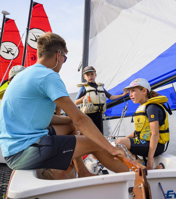 Le moniteur organise la séance pour permettre à chaque enfant d'avoir des conseils et l'orienter dans sa progression sur les techniques de la voile.