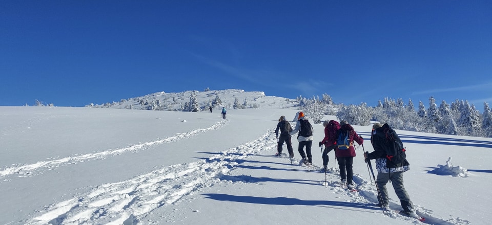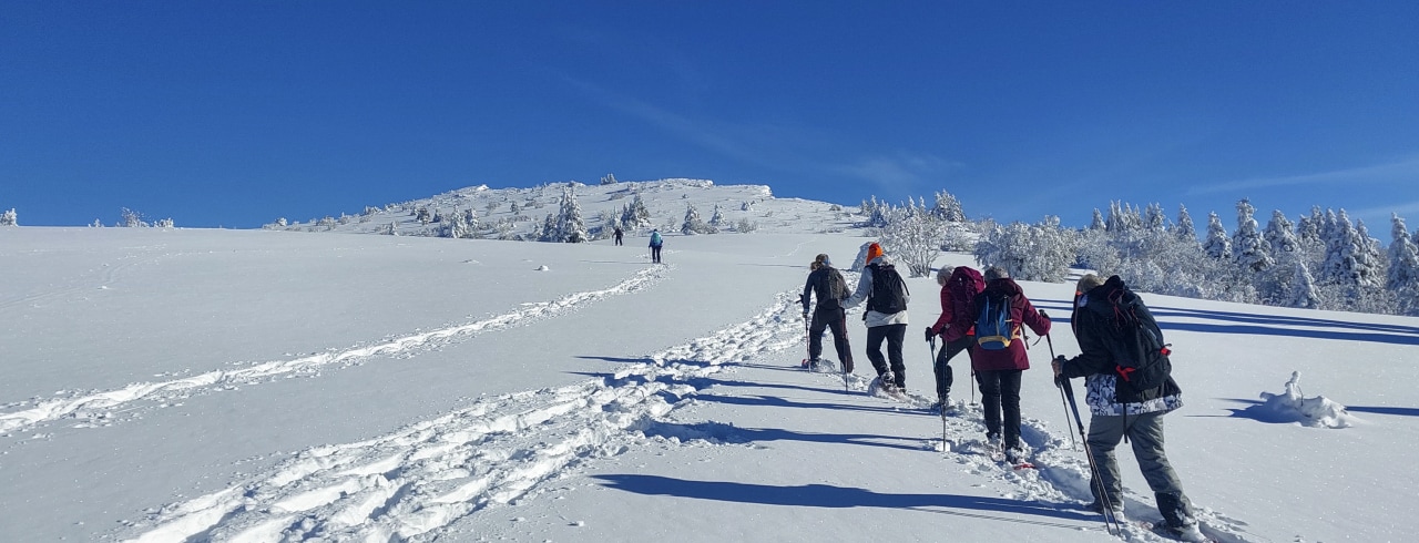 La dernière journée propose une grande randonnée raquettes au cœur d’un environnement sauvage, en direction de la Tête des Chaudières ou d’itinéraires alternatifs selon la météo et le niveau du groupe.